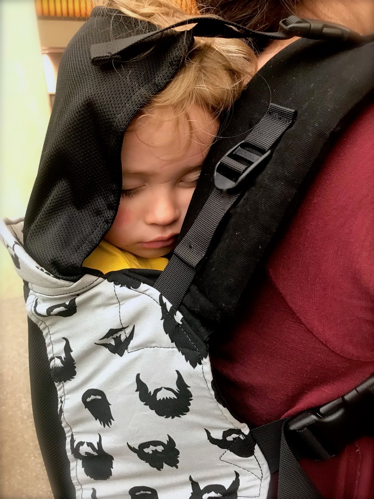 "I have a five year old who is almost turning six. He only weighs 36 pounds and I wear him in a preschool carrier. It has helped in times where we are in crowds and he’s overstimulated, or places where I’d like to walk further and longer than he can. Mostly it’s a space for him to retreat to when tired or overwhelmed. Nothing like those hugs from my back while I walk around!" -Sarah